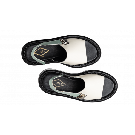 Polished leather buckled sandal, covered wedge heel in leather and crepe sole